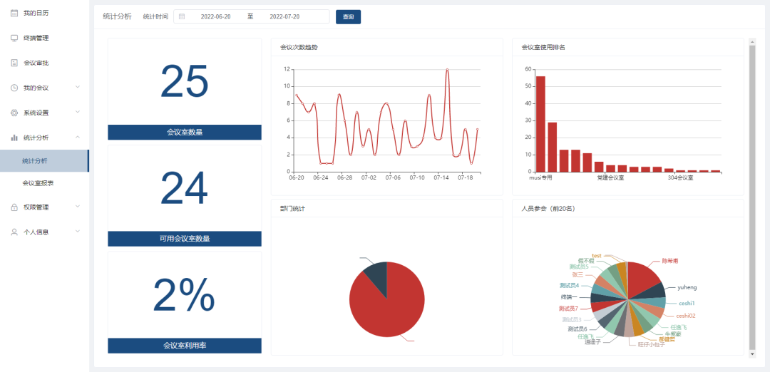 图形化对会议综合数据统计,包括会议时长统计,参会人数统计,会议次数统计;